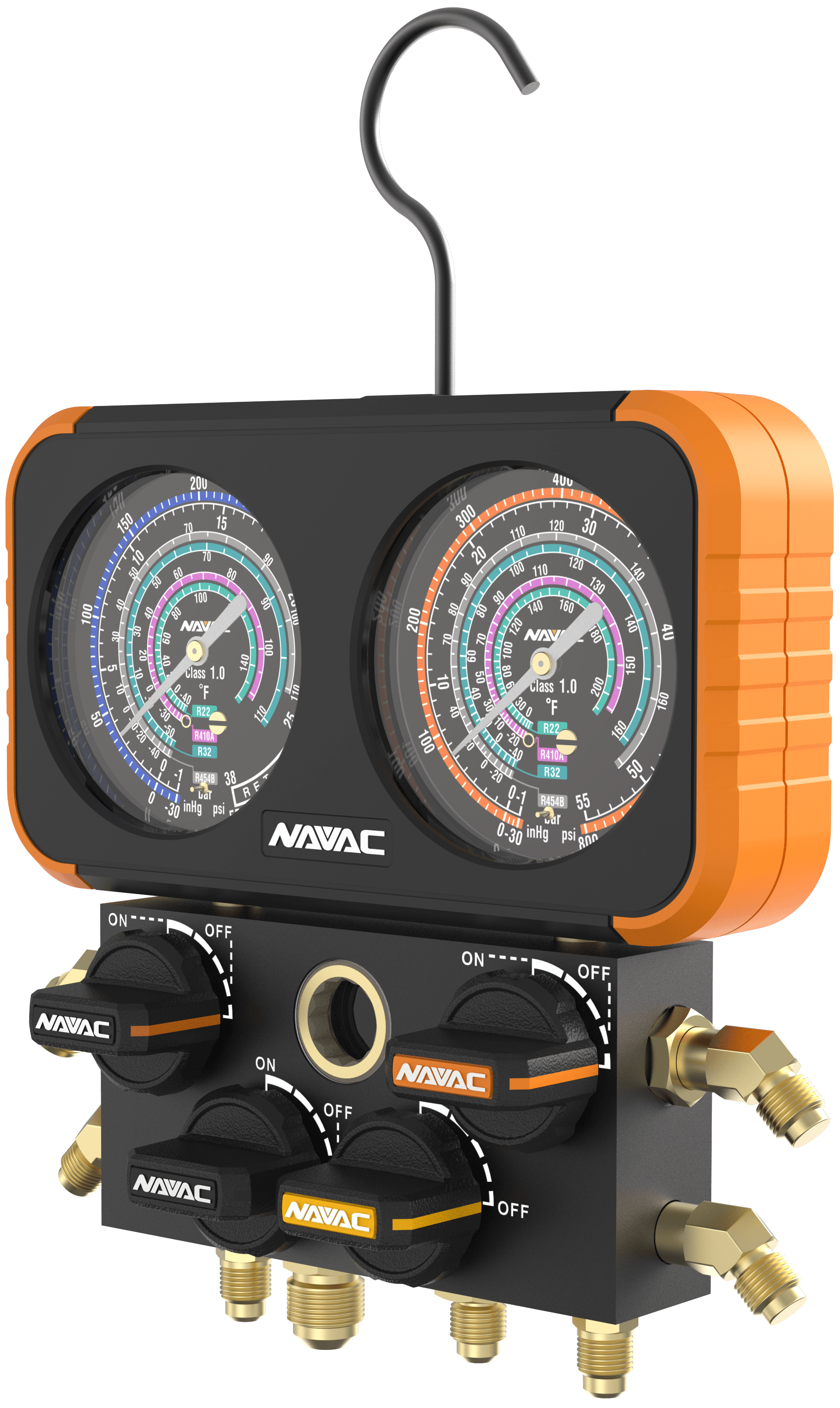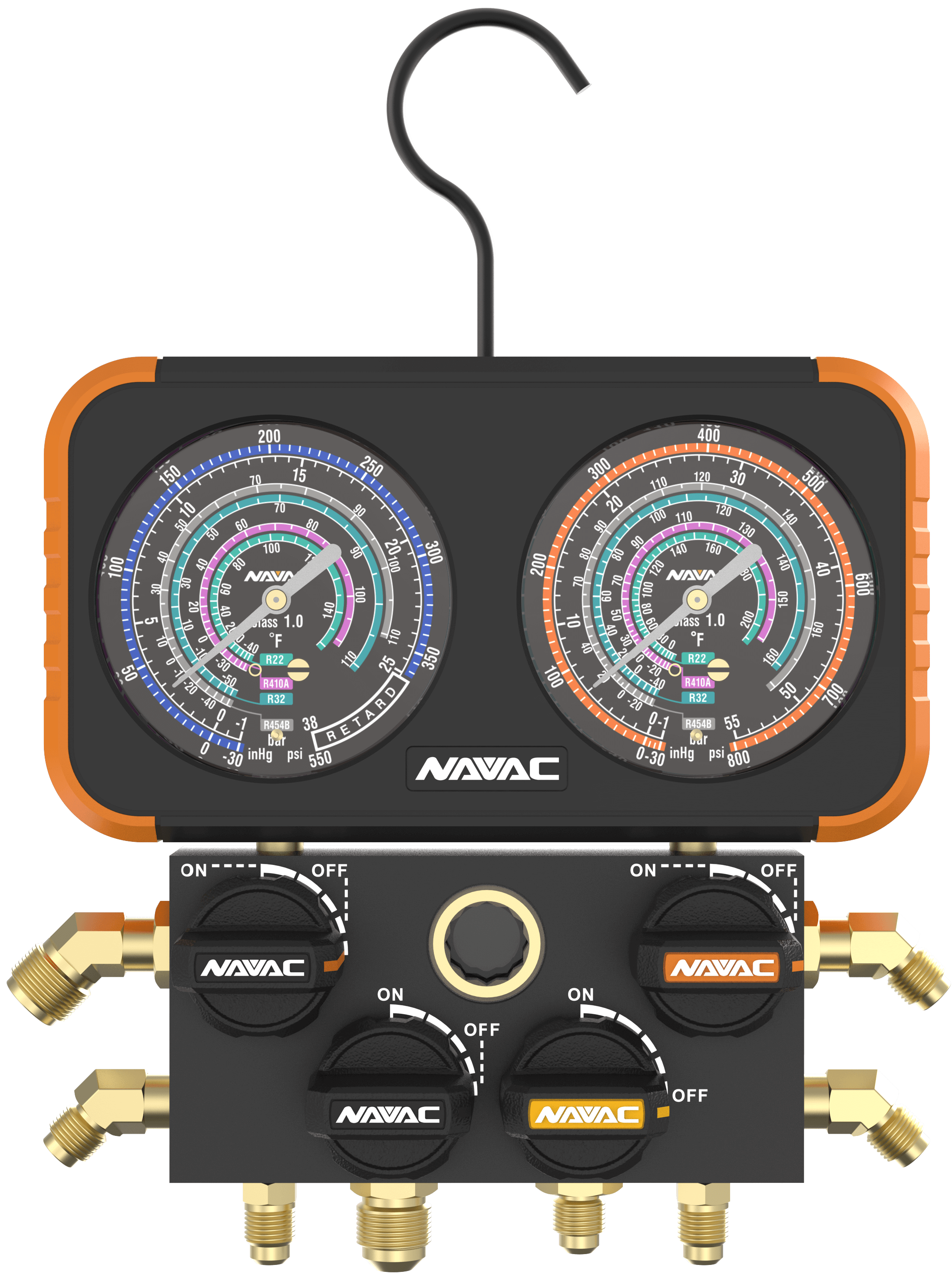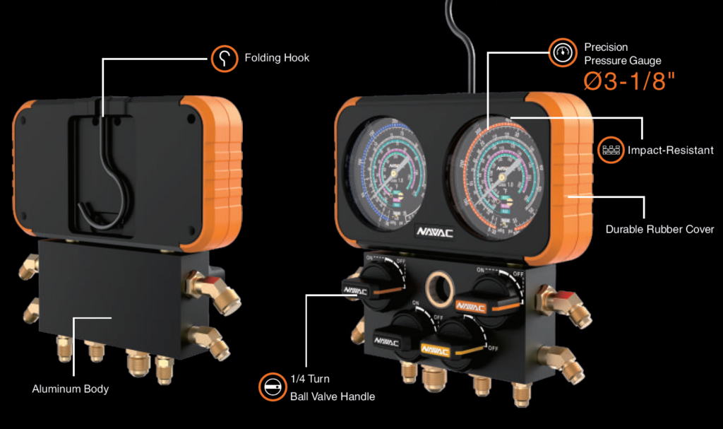 NAVAC N4A4B- 4-Valve Manifold Gauge, Impact-Resistant, optimized for wider applications