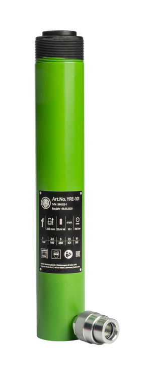 The hydraulic pressure cylinders with collar thread of the YRE series are used with the KUKKO hydraulic program for applications in all positions in crafts, industry, and workshops. The model with a large stroke length enables force-saving and versatile work even in difficult pulling situations or when a lot of force is required.