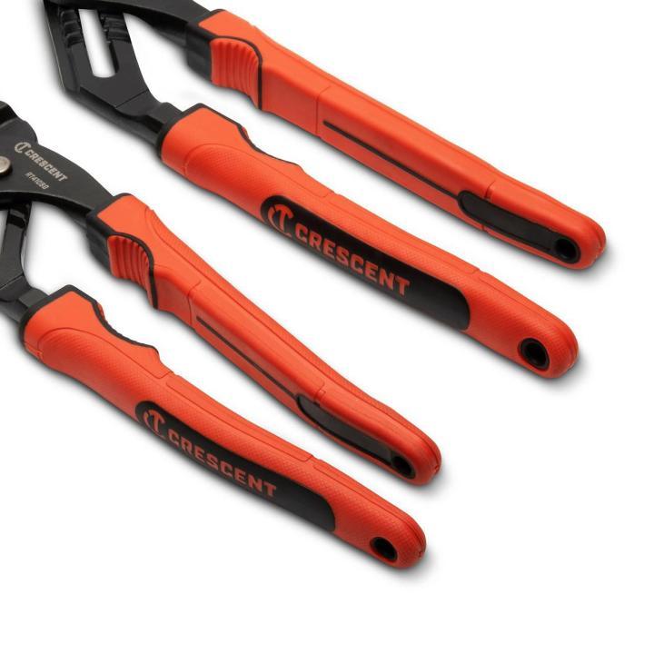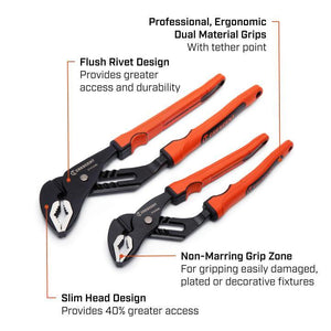 The Crescent 2-Piece Tongue and Groove Pliers Set features a unique tooth design that grips tighter, offering more torque with less effort. The handles feature an integrated non-marring pipe grip to work on shower and sink fixtures without damaging the finish.