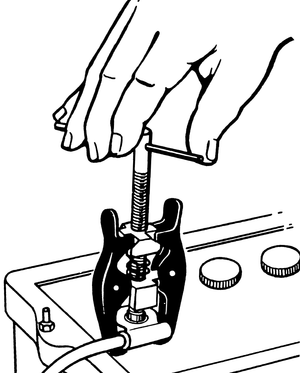 | Loosen the clamp bolt, place jaws under each side of the battery cable clamp and tighten the center screw until the clamp is free |