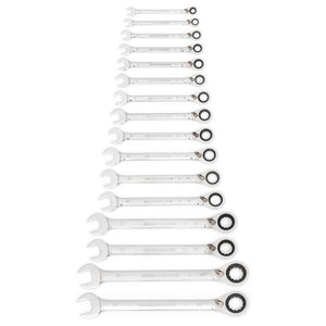 The reversible ratcheting combination wrenches from GEARWRENCH are a staple for every tool box. The flush-mounted reversing lever allows the user to switch motion left to right without needing to remove the wrench from the fastener increasing productivity. The 15° offset on the ratcheting box end allows for greater knuckle clearance and safer access to the fasteners. The ratcheting box end is designed to need as little as 5° to move fasteners versus 30° for standard wrenches and features off-corner loading for a better grip on the fastener and reduces fastener rounding. The wrenches are made from strong alloy steel with a bright, full polish chrome finish.