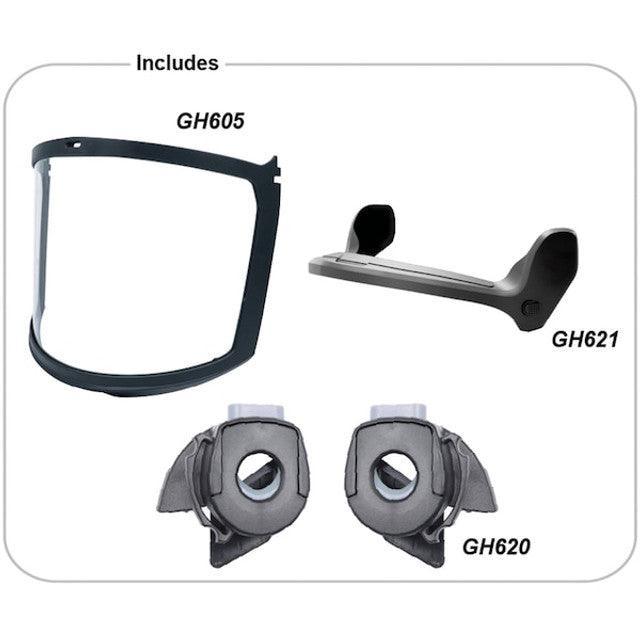 This visor kit meets ANSI/ISEA Z87.1-2020 standards for high-velocity impact protection. It includes the GH620 full face visor adapters, GH605 clear polycarbonate visor, and GH621 full face visor carrier, providing a complete solution to enhance your helmet's protective capabilities.