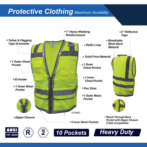 Heavy Duty Surveyor Safety Vest, made from solid material on the front and breathable mesh material on the back, with 1″ heavy webbing reinforcement and 2″ reflective tape, features 10 pockets: 2 outer chest pockets, 2 outer waist pockets, 3 inner waist pockets, 1 reach trough back pocket with zipper closure that can be accessed from both sides, an ID holder and pen slots. The safety vest also offers a radio loop and tether & flapping tape grommets. This safety vest can be used for construction, logistics, road crews, and more.