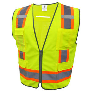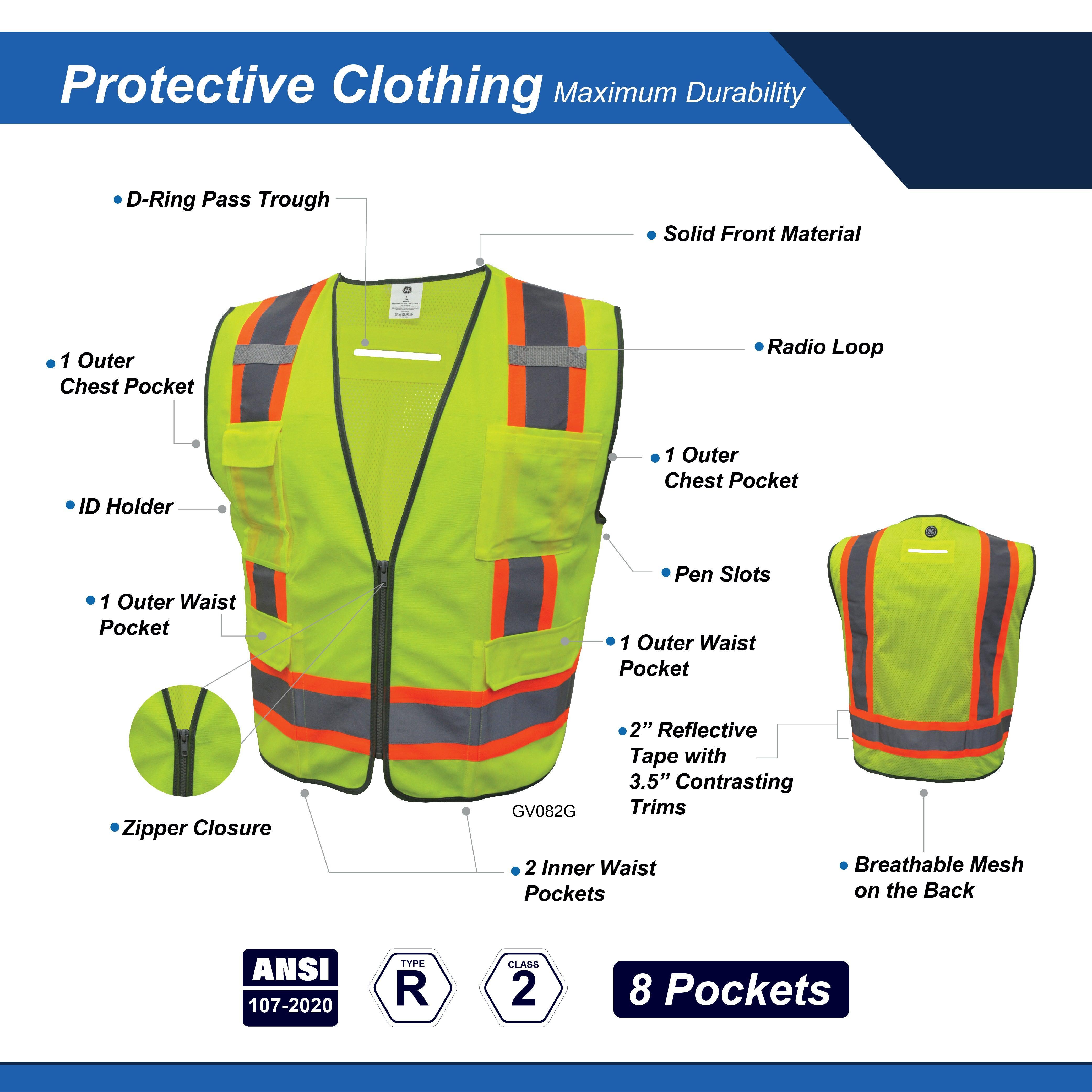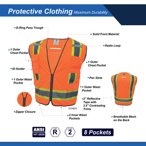 Our Safety Vest, made from solid material on the front and breathable mesh material on the back, with 2” reflective tape and 3.5″ contrasting trims, features 8 pockets: 2 outer chest pockets, 2 outer waist pockets, 2 inner waist pockets, an ID holder and pen slots. The safety vest also offers a radio loop and a D-Ring pass through design. This safety vest can be used for construction, logistics, road crews, and more.