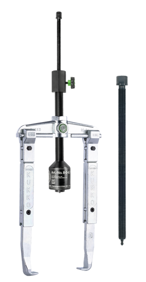The 2-jaw universal puller with extended extractor jaws and hydraulic spindle is used for particularly safe removal of extremely tight and deeply seated bearings, gears, and discs in all common sizes for crafts, workshops, and industry. The hydraulic spindle achieves a tension force of 20 t. This allows for the loosening of any component that is mounted on a shaft and is freely accessible from the outside. For extraction operations with a tension force of up to 10 t and/or in confined spaces, the mechanical spindle can be used.