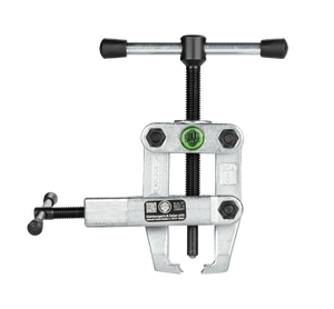 The 2-jaw puller Cobra with side clamp and separating claw is used for pulling flush-mounted ball bearings, bearing rings, and workpieces. The special claw shape of the puller jaws grips underneath the part to be pulled when tightening the clamp and loosens it already before the actual pulling process. At the same time, the clamp increases the pressing force of the puller jaws manifold and thereby prevents slippage of the puller. By tightening the clamp, the sharp claws of the puller jaws grip under the part to be pulled and release it, already before the actual pulling process. The freely movable pin on the T-handle guarantees comfortable, one-handed tightening of the spindle in tight spaces.