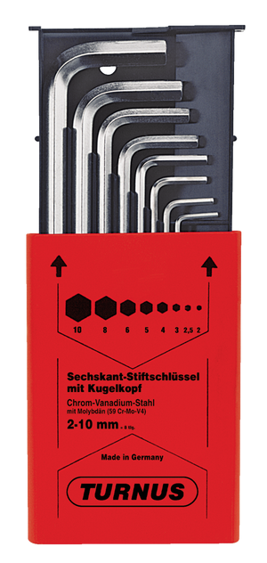 kukko 214-200 short allen key set with ball head, 2, 2,5, 3, 4, 5, 6, 8, 10 mm key sizes for actuating hard-to-reach screw heads in workshops, industry, and crafts