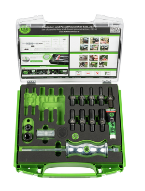 The 14-piece puller and extractor set is used for extracting bushings as well as components with threads (dowel pins, flat keys, bolts, etc.) in craft, industry, and workshops. In addition to a sliding hammer device, various thread inserts are included to extract parts in different sizes.