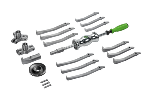 The 20-piece puller set with sliding hammer 224-178 is used for the centric removal of bearings, gears, and discs in all common sizes for crafts, workshops, and industry. When tightening the clamping cone, the puller jaws are automatically centered. By operating the clamping cone, the desired spread can be set. In addition, the puller jaws can be pre-tensioned using the cone to prevent possible slipping. Usable as both an external puller and internal extractor by simply reversing the puller jaws and the clamping cone. The various sizes of puller jaws allow for universal application possibilities. The sliding hammer guarantees contactless and gentle extraction when no support surface is present.