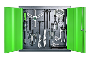 The perforated, 49-piece tool cabinet 224-676 made of sturdy sheet metal is used for the safe and orderly storage of tools. The tool cabinet includes various puller and separator devices, a sliding hammer device, two 3-jaw pullers with interchangeable hooks, as well as different internal extractors along with counter stays. This makes the range suitable for external extraction, internal extraction, and separator pulling. The perforated matrix on the back panel provides enough space for mounting tool holders. The tool cabinet features lockable doors with a cylinder lock, as well as a maximum load capacity of 50 kg. The high-quality steel cabinets can be flexibly integrated into various work environments and thus adapt to individual requirements.