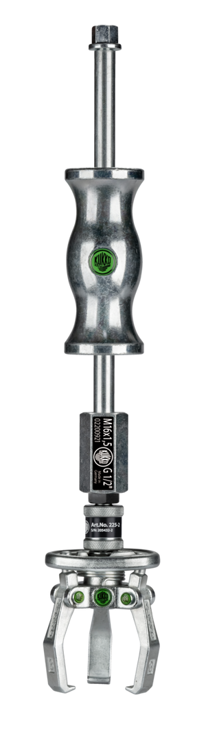 The 3-jaw puller with self-centering jaws and sliding hammer is used for pulling bearings, gears, and discs. The sliding hammer ensures space-saving and at the same time material-friendly extraction. This allows you to loosen any component that sits on a shaft and is freely accessible from the outside. The specially shaped jaws are connected by a spring. This provides a self-tensioning of the jaws and prevents possible slipping during the pulling process. Thanks to the quick release, the jaws can be quickly applied to the component to be pulled. The 3-jaw design guarantees an even load distribution and thus a particularly secure grip on the part to be pulled.