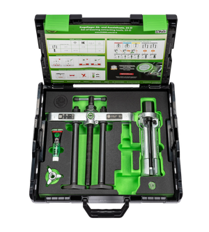 The 3-piece ball bearing puller set 25-D is used for extracting internal bearings, outer bearing rings, and bushings in craft, industrial, and workshop applications. The set includes internal extractors and counter stays. The multi-layer design of the internal extractors with their extra-large gripping edges allows for the safe extraction of internal parts, and together with the counter stays, internal parts can be securely removed.
