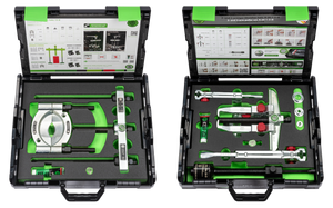 The 12-piece universal puller and separator set of the K-20-15 series is used for hydraulic pulling and separating of ball bearings, roller bearings, inner rings, and other flush-mounted parts in crafts, industry, and workshops. The kit allows for the assembly of 7 different puller models by combining puller jaws and extensions. Together with the separator devices of series 15 and the hydraulic spindle, various construction possibilities arise for optimal use in changing pulling situations.