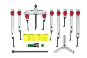 The 13-piece universal puller set with extremely narrow, quickly adjustable jaws of series 2030 is used for the 2-jaw and 3-jaw pulling of gear wheels, bearings, sprockets, synchronizers, etc. for extremely tight and hard-to-reach spaces in craft, industry, and workshop. The series 2030 impresses with its diverse combination possibilities. The kit enables the assembly of 8 different variants by combining jaws and extensions.