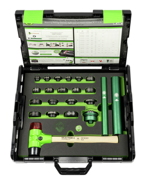 The 22-piece ball bearing installation kit K-71-L-A is used for the fast, precise, and secure installation of bearings and seals in craft, industry, and workshop. The set includes 18 impact rings made of impact-resistant polyethylene terephthalate, 2 impact tubes made of aluminum, an impact head, and a soft-face hammer. The tool set ensures a damage-free installation of bearings without damaging shafts, bearing housings, or seal rings.