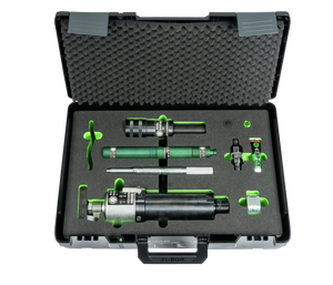 The hydraulic spindle with hand lever operation in the case is suitable for pulling off particularly stubborn bearings, gears, and discs with a pulling force of up to 21 t. Thanks to the integrated grease hydraulic, no external pump is required. The lever arm of the pump can be swiveled 360°. With the help of the fixing ring, the hydraulic spindle can also be used with components with standard through holes.