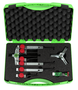 The 9-piece Universal Puller Set with narrow puller jaws from the series KS-2030-1-193+S is used for pulling bearings, gears, discs, etc. in tight and hard-to-reach spaces in crafts, industry, and workshops. The kit allows switching between 2-jaw and 3-jaw pullers and different jaws, resulting in 4 different variations.
