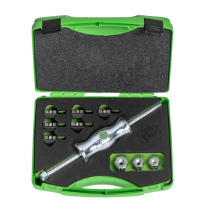 The 10-piece sliding hammer set in the case KS-22-01 is used for pulling bushings as well as components with threads (dowel pins, key profiles, bolts, etc.) in crafts, industry, and workshops. The use of a sliding hammer is particularly recommended when there is no support surface available or when this is too sensitive. The ergonomically shaped, solid sliding piece allows the applied force to be optimally transmitted and a strong shock effect to be achieved. Additionally, it ensures contactless and gentle extraction. The thread adapters included in this set can be used for both internal and external threads.