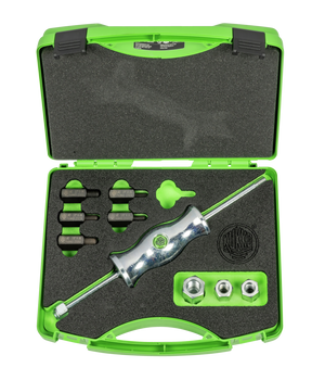 The 9-piece sliding hammer set in the case KS-22-01-UNC is used for pulling sockets and components with threads (dowel pins, keyways, bolts, etc.) in crafts, industry, and workshops. The use of a sliding hammer is particularly advisable when there is no support surface available or when it is too delicate. The ergonomically shaped, solid sliding piece allows for optimal force transfer and achieves a strong shock effect. This also ensures a non-contact and gentle extraction. The thread adapters included in this set can be used for both internal and external threads.
