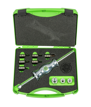 The 10-piece sliding hammer set in the case KS-22-02 is used for pulling plugs and components with threads (dowel pins, key stock, bolts, etc.) in crafts, industry, and workshops. The use of a sliding hammer is particularly advisable when no support surface is available or when it is too sensitive. The ergonomically shaped, solid sliding piece allows the applied force to be optimally transmitted, achieving a strong shock effect. It also ensures contact-free and gentle pulling out. The thread adapters contained in this set can be used for both internal and external threads.