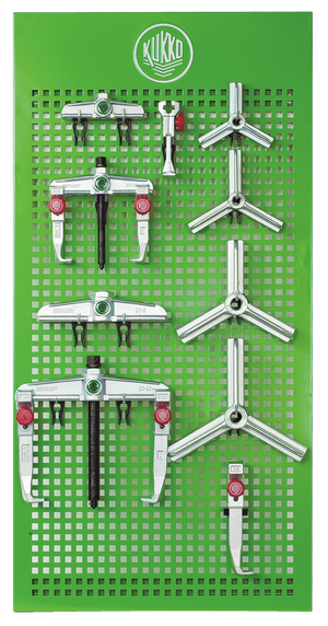 The BASIC puller assortment for external extraction is a wall panel equipped with suitable tools for use and storage in workshops and industry. The assortment includes various 2-jaw and 3-jaw crossbars and hooks that can be combined into different external pullers for various applications, thanks to the KUKKO modular system. This allows for the loosening of any component sitting on a shaft and accessible from the outside.