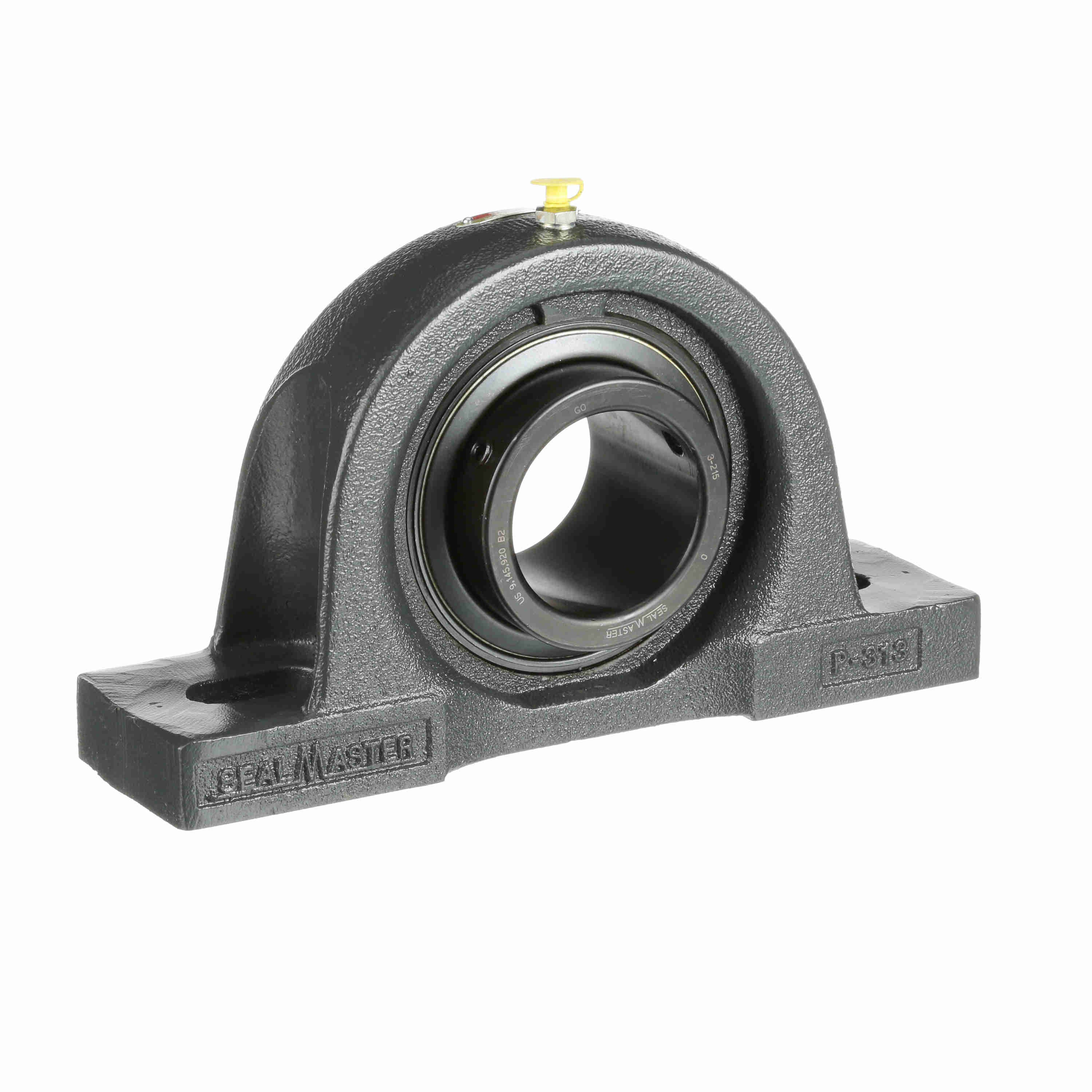 The Sealmaster Mounted Cast Iron Two Bolt Pillow Block Ball Bearing is a robust, ready-to-mount bearing unit designed for reliable performance in normal to medium-duty applications. Featuring a solid one-piece cast iron housing, this pillow block ensures maximum strength and rigidity. The bearing insert, crafted from 52100 bearing steel with a black oxide coating, provides excellent corrosion resistance and durability. It utilizes a setscrew locking collar or Sealmaster’s exclusive Skwezloc® concentric locking collar for secure shaft attachment, minimizing slippage. The unit includes felt seals to protect against contaminants and retain lubrication, with a relubricatable design for extended bearing life. The two-bolt base allows for straightforward installation, supporting radial or radial-and-thrust loads. With a wide range of bore sizes and configurations, this bearing is ideal for applications such as conveyors, industrial machinery, and material handling systems. Sealmaster’s innovative features, like the lock pin and dimple system, enable direct lubrication and prevent outer ring rotation, ensuring optimal performance and reduced maintenance.