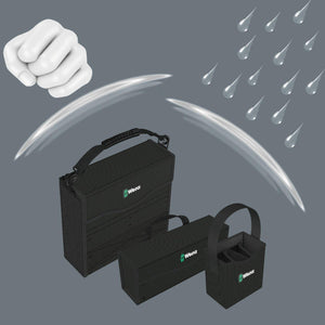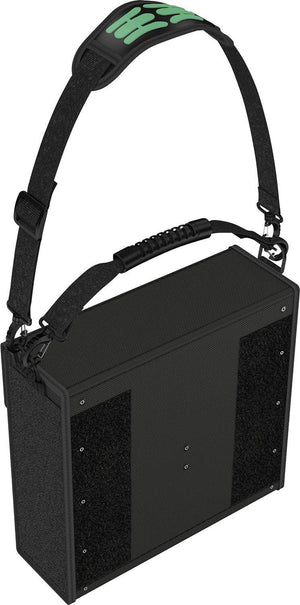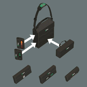 The Wera 2go tool container is the ideal solution for individual and convenient tool transport thanks to its hook and loop fastener system and its compactness. The inner and outer hook and loop fastener zones ensure a maximum in terms of space utilisation. This means that an incredible number of tools can fit in and on the container. Wera 2go 2 ensures a low weight since only the tools really needed for the job are taken along. The robust and dimensionally stable material protects the tools carried against damage and moisture and enhances the service life of the tool container. The padded and width-adjustable shoulder strap and the snug fit of the container on the body mean that the container is easy and convenient to carry. The hands remain free during transport. It comes with a quiver with an individually adjustable hook and loop fastener partition for screwdrivers and other tools.