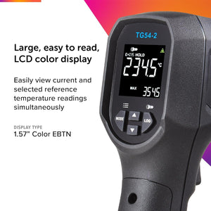 The FLIR TG54-2 provides non-contact temperature readings so you can swiftly and effortlessly take measurements without compromising on safety. Providing a distance-to-spot ratio of 20:1, the TG54-2 can measure smaller targets from a safer distance. Achieve pinpoint precision with infrared technology, Class II laser sighting, and a maximum IR temperature of 850°C (1562°F). For reliable performance in demanding applications, the thermometer is built to withstand a drop of 3 m (9.8 ft) and is IP65 rated.