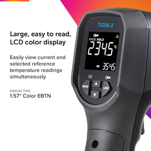 The FLIR TG56-2 provides safer temperature readings where high temperature readings are required. Providing a distance-to-spot ratio of 30:1, the TG56-2 can measure smaller targets from a safer distance. Pinpoint precision is driven by infrared technology, Class II laser sighting, and a maximum IR temperature of 1300°C (2372°F). The color display screen is designed for you to easily view current and selected reference temperature readings simultaneously. The thermometer includes a Type K thermocouple for contact temperature readings.
