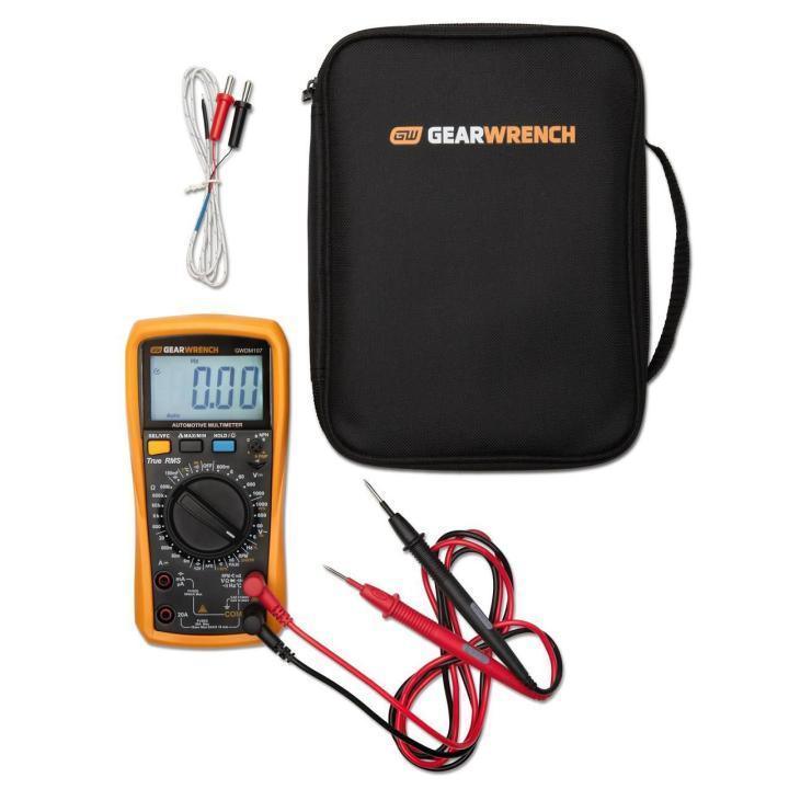 GearWrench GWDM107 - Automotive Pro True RMS Digital Multimeter, measures AC/DC voltage up to 1000V, AC/DC current up to 20A, and resistance up to 60MΩ.