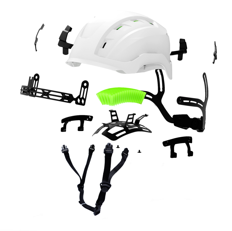 10 Slots designed to accommodate and securely attachdifferent accessories in the front, rear, and sides. Theseinclude flashlights, protective eye shield, full face visors,protective earmuffs, ID holder, and more.