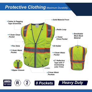 Heavy Duty Engineering Safety Vest, made from solid material on the front and breathable mesh material on the back, with 2” reflective tape and 3″ contrasting trims, features 8 pockets: 2 outer chest pockets, 2 outer waist pockets, 2 inner waist pockets, an ID holder and pen slots. The safety vest also offers a radio loop and tether & flapping tape grommets. This safety vest can be used for construction, logistics, road crews, and more.