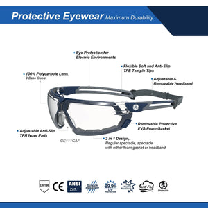 Our 11S Series safety glasses have a polycarbonate frame and a 100% polycarbonate lens with a 9 base curve. They are scratch and impact resistant, meeting ANSI Z87.1 standard, and provide 99.99% UV protection. These safety glasses feature a 2 in 1 design with a removable protective foam gasket and an adjustable & removable headband. You can use these glasses as spoggles or as regular safety glasses. They also have an adjustable soft TPR nose pads and flexible soft and anti-slip TPE temple tips.