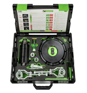 The hydraulic hub puller is used for pulling hub assemblies on passenger cars and trucks. The grease-hydraulic spindle achieves a pulling force of 20 t. Up to six pulling jaws can be used on the partial disc, making the puller universally applicable. Additionally, the pulling jaws can be adjusted to two different lengths. The 22-piece set includes: one partial disc, six pulling jaws, twelve insert rings in different sizes, one hydraulic spindle, and two pressure pieces.