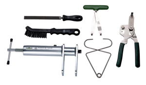 The brake caliper tool assortment of series 126 is used for a quick and time-saving repair on brake calipers in the automotive sector. The assortment includes a piston retraction device, brake pad puller, brake piston retaining clip, brake piston pliers, brake caliper brush, and brake caliper file for general use in vehicle maintenance.
