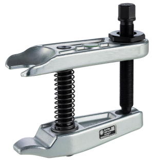The ball joint extractor with lever translation of series 129 is used to press out the ball pins when removing ball joints and tie rod ends on steering rods in passenger cars. Tight space conditions allow little room for the gentle positioning of the press. Due to its special design, the disassembly of the support joint occurs without contact with other axle components, thus protecting the sensitive surfaces. Series 129 impresses with its versatility in application. The version 129-4-30 has been specifically developed for applications on the Audi R8. The lever clamping range can be adjusted via the thread of the center spindle.