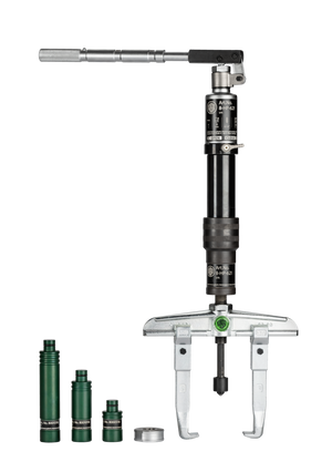 The 2-jaw universal puller with hydraulic spindle is suitable for pulling particularly stubborn bearings, gears, and discs with a pulling force of up to 20 t. Thanks to the integrated grease hydraulic, no external pump is required. The manually extendable lever arm can be swiveled 360°. The flexible connection thread on the spindle allows for the mounting of numerous puller tools from the KUKKO range, depending on thread size.