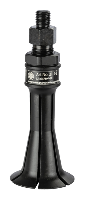 The segment internal extractors of the series 21-E with M10 thread are used for extracting flush-mounted bearings, bearing outer rings, bushings, and seals in craft, workshop, and industry. The segmented design with extra fine gripping edges allows for the safe extraction of flush-mounted parts. The series 21 impresses with its compatibility and versatility of applications. Depending on the application case, there are numerous variants of the segment internal extractors. They are used either together with counter stays or with sliding hammers.