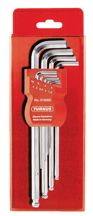 kukko 215-002 long angle screwdriver with ball head, 1,5, 2,0, 2,5, 3,0, 4,0, 5,0, 6,0, 8,0, 10,0 mm key sizes in the turnus clip in retail packaging for operating hard-to-reach screw heads in workshops, industry, and crafts