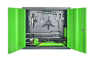 The sturdy 10-piece tool cabinet 224-677 made of solid sheet steel is used for the safe and organized storage of tools. The tool cabinet includes a hydraulic puller with a combination traverse and hand pump, a 3-jaw puller, and an internal extractor with a sliding hammer. This assortment is suitable for both external extraction and internal extraction. The hole grid on the back wall offers enough space for attaching tool holders. The tool cabinet has lockable doors with a cylinder lock and a maximum load capacity of 50 kg. The high-quality steel cabinets can be flexibly integrated into a variety of work environments, thus adapting to individual requirements.