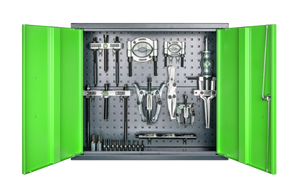 The equipped, 30-piece tool cabinet 224-678 made of sturdy sheet steel is used for the secure and organized storage of tools. The tool cabinet includes various pullers and separators, an internal extractor with sliding hammer, two 3-jaw pullers, and different thread adapters. This assortment is suitable for external extraction, internal extraction, as well as for separation pulling. The hole grid on the back wall provides enough space for attaching tool holders. The tool cabinet is equipped with lockable doors with a cylinder lock and has a maximum load capacity of 50 kg. The high-quality tool cabinets can be flexibly integrated into various work environments and adapt to individual requirements.