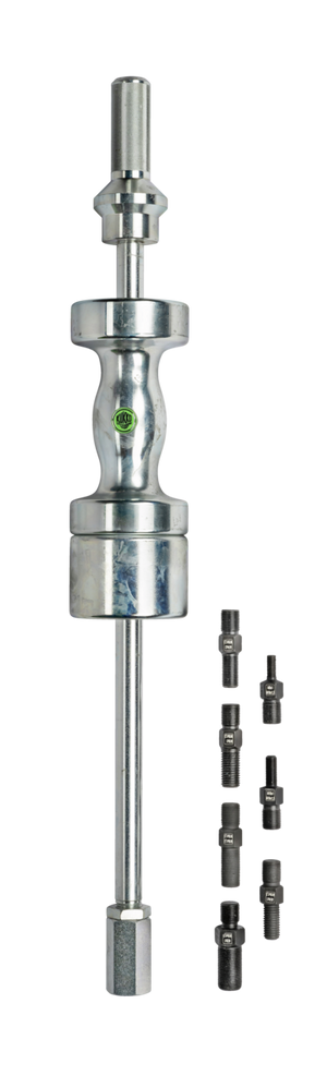 The bolt extraction device set with thread adapters of series 225-S is used for extracting bolts such as brake shoe bolts or spring bolts on commercial vehicles. It includes a 8 kg kg impact hammer in solid design as well as a set with 7 different thread inserts to be prepared for any extraction situation.