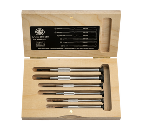 The nickel-free watchmaker screwdriver sets in the wooden box of series 250 are used for precision work for the highest demands in craftsmanship and watchmaking. The screwdrivers with rotatable hexagon heads and knurled fine screw grips allow for the controlled transmission of strong torque. Made from corrosion-resistant aluminum, the handle ensures exceptionally high strength. Thanks to the rejuvenated handle shape, quick screwing is enabled. Depending on requirements, the set contains screwdrivers for various profile sizes and types. The information in the wooden box helps know exactly which screwdriver is needed.