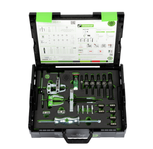 The 22-piece universal puller set of series 27-A is used for pulling, separating, and internal extraction of bearings, gears, discs, etc. in crafts, workshops, and industry. The set is versatile for external extraction, internal extraction, and internal extraction with engagement in the ball bearing. Included in the set are the bearing puller Cobra, various internal extractors, counter stays, and a sliding hammer, as well as thread inserts and a small part puller, ensuring a wide range of applications.