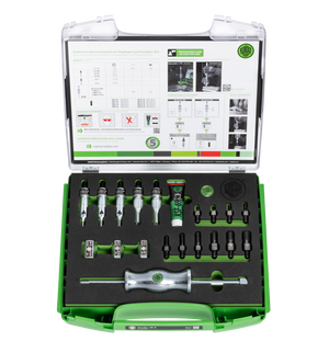 The 28-A 19-piece sliding hammer set is used for the contactless extraction of internal bearings, bearing outer rings, and bushings, as well as components with threads (dowel pins, key strips, bolts, etc.) in craft, workshop, and industry. The multi-shell design of the internal extractors, with their extra-large gripping edges, allows for the safe extraction of internal parts. The included sliding hammer is used together with the internal extractors. Additionally, there are thread inserts for extracting parts with concentric threaded holes in the set, which are used together with the sliding hammer.