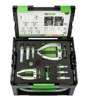 The 28-C 22-piece sliding hammer set is used for non-contact extraction of internal bearings, bearing outer rings, and bushings as well as components with threads (dowel pins, key steel, bolts, etc.) in crafts, workshops, and industry. The multi-shell design of the internal extractors with their extra-large gripping edges allows for secure extraction of internal parts. The included counter stay or sliding hammer will be used together with the internal extractors, depending on whether a sufficient support surface is available. Additionally, the set includes thread inserts for extracting parts with concentric threaded holes, which are used in conjunction with the sliding hammer.