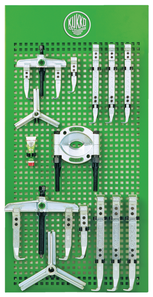 The BASIC puller range for the industry is a wall panel equipped with suitable tools for application and storage in workshops and industry. The range includes not only 2-jaw universal pullers but also 3-jaw traverses and various hooks, which can be combined into different external pullers for various applications thanks to the KUKKO modular system. Together with the included separator device, the range is suitable for external extraction, internal extraction, and bearing separation, making it ideal for versatile use in the industry.
