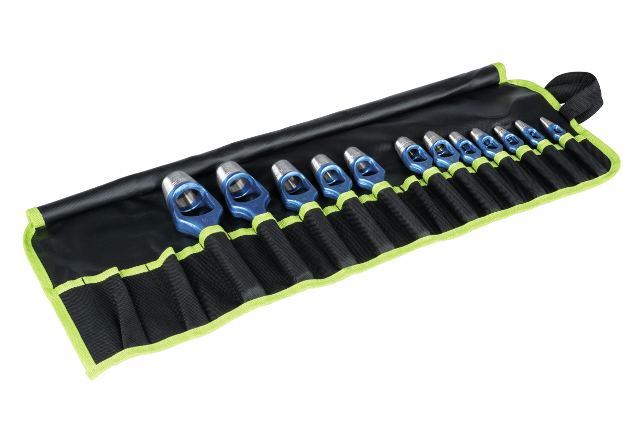The 9-piece set of hole punches with different diameters is used for punching holes or creating seals and sealing rings from rubber, leather, felt, plastic, cork, as well as various fabrics. The short hollow cylinder is sharply cut at the bottom edge. The conical punch head is attached to two supports, resulting in a dual recess. Thanks to the particularly sturdy design of the hole punches, a wide variety of materials can be processed. The practical roll-up bag made of plastic provides maximum organization and is also ideal for transport.