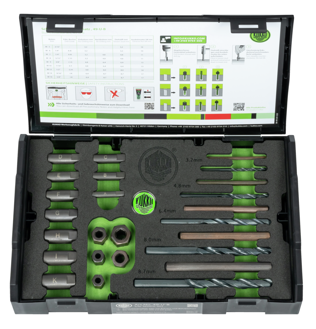 kukko 49-u-b screw extractor set with drill bits, drill socket, for ø m5 - m16 for universal extraction of broken bolts and screws