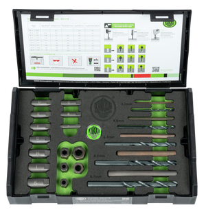 The 25-piece screw extractor set with drills and drill sockets is used for universal extraction of broken bolts and screws. The screw extractors are an indispensable tool that neither hobbyists nor professional craftsmen can do without. The set includes screw extractors for screw threads from M5 to M16.